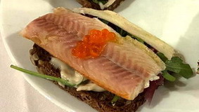 - - Ajoblanco con gallo macerado, mojama y huevas de pez volador.