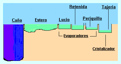 Para la explotación salinera, el hombre, desde hace siglos, ha ido configurando la zona hasta lo que es actualmente, una red de caños y lagunas junto con un sistema de compuertas que permite que el agua pase, durante la pleamar, de los caños a los esteros y de éstos a los evaporadores (en otras zonas salineras se llaman calentadores) y por último a los cristalizadores, especie de cubetas de poco fondo donde, por evaporación del agua, se produce la sal.