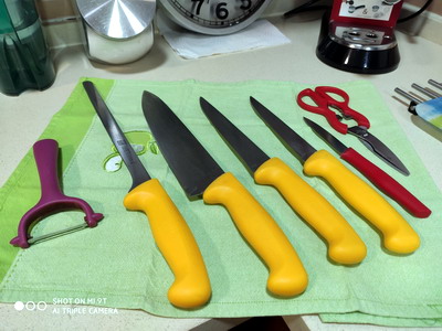 HENNKEL: (Zwilling), muy buena, alemana (cebollero desde 30 euros). Los amarillos de la foto (estos tienen más de 15 años de uso intenso).