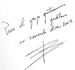 De ahí volvimos a la cocina, donde nos esperaba el "maestro", cerebro de la revolución culinaria ofrecida y que realmente nos había emocionado. Ferrán se mostró sencillo y amable, algo parco en palabras, como queriéndole quitar importancia a nuestras felicitaciones, a las que, sin duda, debe estar más que acostumbrado. Como antes lo había comentado Juli, nos transmitió su admiración por la cocina andaluza, recordándonos que regentan la Hacienda Benasuza sita en Sanlúcar la Mayor (Sevilla), lugar donde también podemos emocionarnos sin atravesar nuestra "piel de toro" de punta a punta. Con su dedicatoria a nuestro Grupo Gastronómico y el regalo de dos de sus libros gastronómicos, nos despedimos hasta otra ocasión.