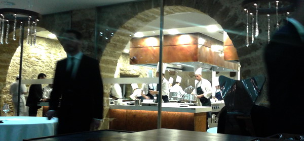 Servicio ameno y magnífico, con personal muy atento, sin agobiar, con camareros asignados a cada mesa y prestos a despejar cualquier duda que uno tuviera con sencillez y una sonrisa por delante. Los platos se sucedían con tal cadencia que no daba tiempo a aburrirse entre uno y otro. El jefe de todo el cotarro, Angel León, participó en la puesta en escena de dos de los platos más emblemáticos, las chacinas marinas y el choco a la prensa.