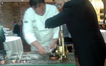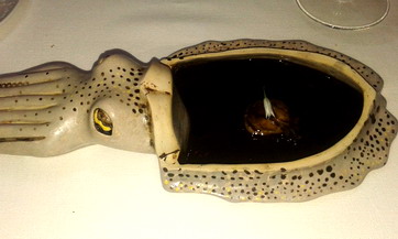 Consiste en prensar un choco hecho a la brasa y sacar su jugo, que luego, a la manera de Frederic Delair (La Tour D'argent de hace dos siglos) se mezcla con un armagnac o brandy (En nuestro caso fue esto úlimo) flambeado ante el cliente, que se vierte sobre dos buñuelos o ñoquis de carne de choco con una flor de ajo en lo alto. Original la idea de aplicarlo al choco, resultando un sabor muy intenso, pero que, en este caso (supongo), resultó un poco salado.