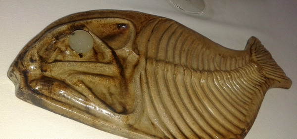 La cubertería y la cristalería son de estilo moderno y muy elegantes, destacando la vajilla, compuesta de una serie de platos, algunos a los que se puede objetar cierta ampulosidad, pero que van acorde con lo que el local ofrece. Lo más clásico son platos llanos pero siempre con motivos marinos (Escamas, ondulaciones, etc.), o eso me parecía a mí. Diseñada también por Javier Ayarza, hay platos en forma de caballa para la caballa, en forma de choco para el cefalópodo, con apariencia de piel de morena, con forma de cola de ballena, como esponjas marinas para sopas, etc.