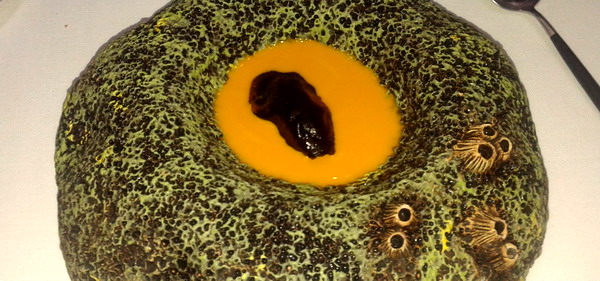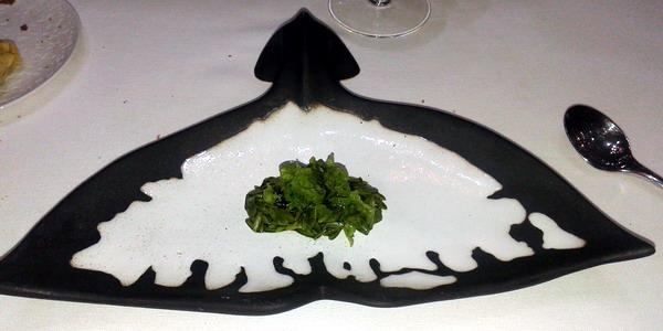 Crema de ortiguillas con ortigas de campo, tagarnina y huevas de caracol, más un cordón de mantequilla de plancton. Hay a quienes les parece un poco pesada, pero para mi gusto se trataba de uno de los platos más sabrosos y mejor conseguidos.