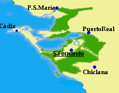 En esta marisma de lecho fangoso formada por la sedimentación fluvial, el mar ha ido abriendo vías de entrada, los llamados caños, formando una intrincada red de caminos de agua salada que llegan hasta las partes más alejadas de la marisma. El mayor de estos caños es el de Sancti-Petri que comunica el océano Atlántico con la bahía de Cádiz, convirtiendo a Cádiz y San Fernando en una isla. Durante la pleamar, estos caños se desbordan inundando los terrenos colindantes y formando una zona de pequeñas lagunas que se denominan esteros.