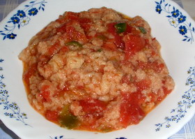 Póngase en un recipiente a hervir unos dos litros de agua, en la cual coceremos los tomates enteros durante unos minutos, pelamos y reservamos. En una gaveta o mortero, majamos los ajos con un poco de sal, los pimientos verdes y los tomates cocidos. Se le añade las migas de pan, poco a poco, algo de agua de la cocción de los tomates y el aceite, removiendo con el machacador del mortero, hasta que nos quede homogénea. Se puede decorar con tiras de pimientos asados, huevo duro, y tomar acompañado por unos rabanitos y láminas de pan tostado.