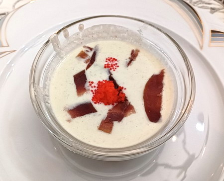 En un cuenco pequeño o un plato hondo, ponemos al fondo el Gallo macerado, encima el ajo blanco y flotando unas finas láminas de mojama, finalmente media cucharadita de huevas de pez volador