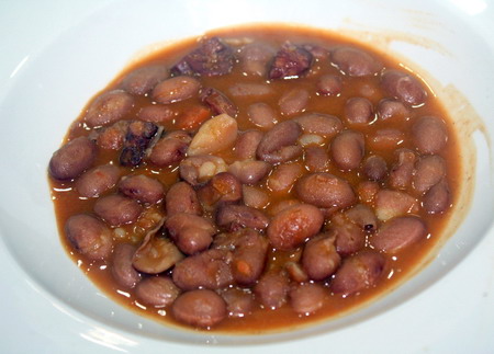 En la misma olla rápida se hace un sofrito con la cebolla y los pimientos, una vez pochado se añade las alubias con las zanahorias y las patatas tronchadas.