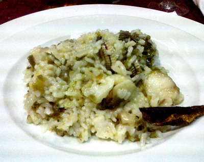 Preparación: Ponemos a hidratar las algas 15 minutos. Sacamos la piel del bacalao y reservamos, troceamos el pescado en trozos pequeños, troceamos la piel en tiras y freímos en el aceite de oliva hasta que estén doradas, reservamos. En una cazuela apropiada, ponemos el aceite de freír las pieles, los ajos picados y el puerro troceado, una vez este tierno el puerro añadimos las algas picadas y el bacalao, salteamos, añadimos el arroz, salteamos el conjunto y añadimos dos vasos y medio de agua caliente por vaso de arroz, cocer 15 minutos sin mover. Si decidimos poner los berberechos, abrirlos al vapor en otra sartén, desechar los que no se hubieran abierto y añadir al arroz en el último momento.