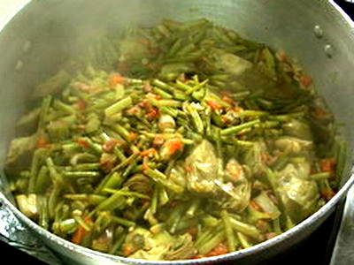 Hacemos el refrito con 3 dientes de ajos, y los pimientos. En el momento de pochar los pimientos agregamos los alcauciles y los troncos pelados y cortados en trozos, y a continuación las tagarninas, y un poco de sal.