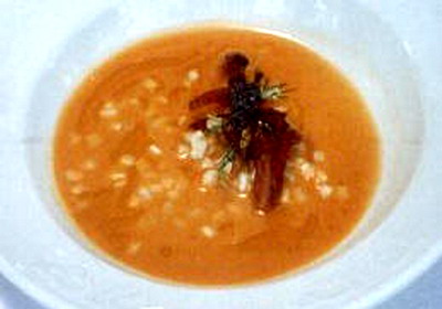 Sobre el caldo se coloca el atún pasado por la plancha en trozos pequeños, las tiras de piel de naranja y el apio muy picado.