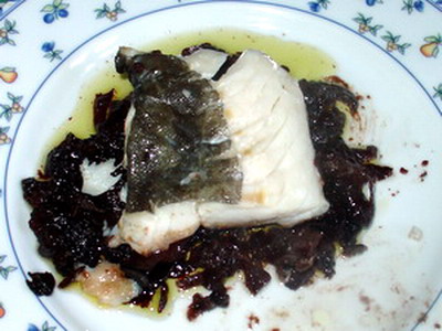 El bacalao, ya sabéis, en aceite, piel arriba y cuando empiece a deshojar está listo.