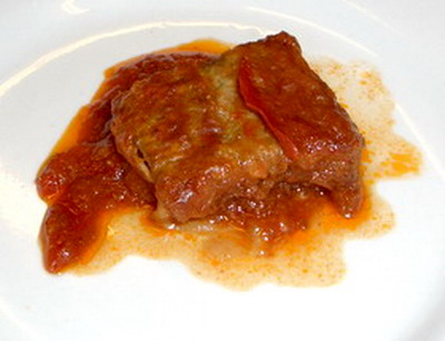 Secamos los trozos de bacalao y lo pasamos ligeramente por el aceite hirviendo, y lo sacamos y reservamos. En el mismo aceite agregamos los dientes de ajo pelados y laminados, a continuación las cebollas cortadas finamente, una vez pochadas echamos el pimiento rojo cortado a trocitos y cuando están a medio cocer le sumamos los tomates pelados y cortados.