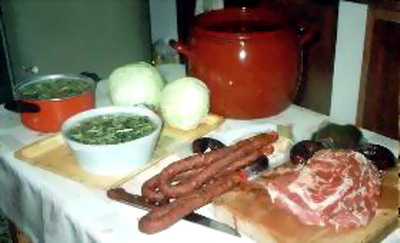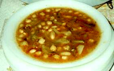 Al día siguiente, escurrirlos y echarlos en ollas separadas, agregar las tagarninas -bien lavadas y cortadas a trocitos-, el apio, el pimentón, las manitas de cerdo -partidas por la mitad-, el codillo y el magro de cerdo, el tocino, el chorizo, repartidos en ambas ollas y, en los garbanzos, poca sal.