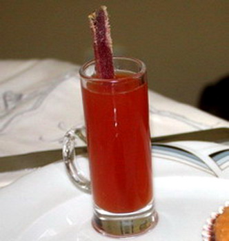 Poner en el frigorífico un cuenco grande, colocar encima a unos 15 centímetros del cuenco los tomates envueltos en un lienzo doble (trozo de sábana limpia) que podemos atar a la bandeja superior, y dejar que durante la noche destile su jugo. En el momento de servir en el chupito, poner un poco de sal, pimienta, una cucharadita de vodka, un poco de orégano y el bastoncillo de mojama.