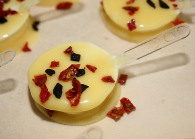 Mientras tanto, en otra olla calentamos el chocolate blanco, esta crema será la cobertura del bombón helado. Cuando el molde se haya congelado bien, lo bañamos con el chocolate y decoramos con un puñado del tomate seco picado y un poco de polvo de aceituna.