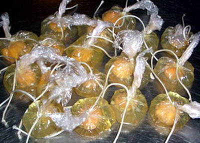 Coger una taza y colocar dentro un trozo grande papel film, que sobresalga de la taza. Verter el huevo en la taza y cerrar el papel film de manera que el huevo quede dentro y bien apretado. Atar el extremo con un cordel o cualquier otro medio (como se ve en la foto) y reservar. Hacer lo mismo con todos lo huevos.