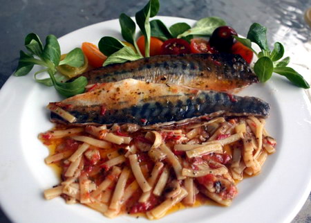 Sazonar y añadir las babetas y un minuto más tarde las caballas, para que la cocción no sea larga y el pescado no se pase.