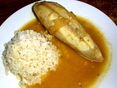 Un bol de arroz blanco, un calamar y la salsa por encima