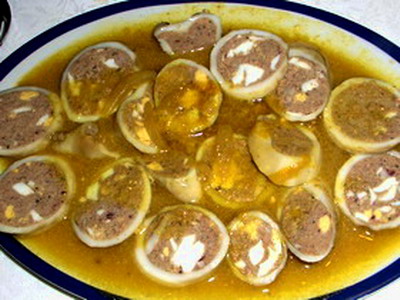 Sofreír la mitad de la cebolla y todos los ajos con aceita de oliva. Cuando empiecen a dorar añadir la carne picada y las patas del calamar troceadas. Remover. Sazonar con sal y pimienta al gusto y añadir 1/2 vaso de vino blanco. Remover y dejar a fuego medio durante 10 minutos. Retirar y añadir el huevo duro previamente picado.