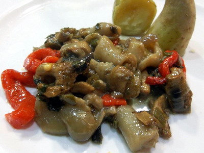 - En una sartén rehogamos los ajos, cebollas y pimientos finamente picados en el aceite de oliva virgen extra (AOVE según las tendencias actuales de denominarlo todo con siglas). Cuando el sofrito esté suficientemente pochado, echar las setas hasta que se pongan tiernas.