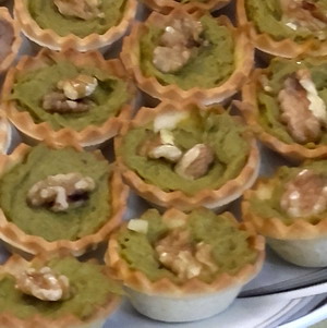 Cocer las tagarninas troceadas, limpias y lavadas (mejor al vapor), poner en la sartén el aceite y los ajos picados, cuando comiencen a cambiar de color añadir las tagarninas. Cuando estén tiernas añadir la sal, el azúcar y la pimienta al gusto. Tras rehogar unos minutos dejar reposar y batir con brazo mecánico. Enfriar en frigorífico. Montar en canastillas y poner un trozo de nuez pelada encima.