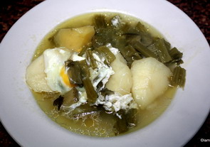 Antes de retirarlo del fuego, comprobamos que las patatas estén tiernas y rectificamos de sal. Al sacar para servirlo, escalfamos un huevo por comensal.