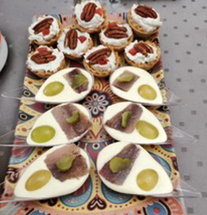 Mezclar bien los quesos con el brandy y la pimienta. Poner una cucharada en la cestita con un trozo de nuez y un cubito de mango encima.