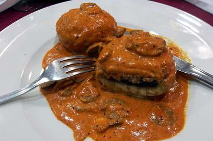 CHAMPIÑONES RELLENOS DE CARNE Y JAMÓN CON SALSA DE PIQUILLOS