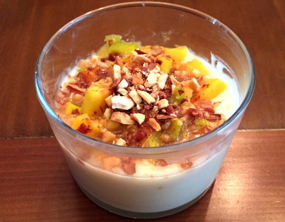 5. Colocar la mezcla en los recipientes donde lo vaya a servir. Colocar encima una capa de dados de mango y encima de estos, espolvorear las almendras garrapiñadas picadas.