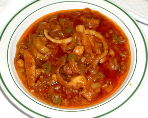 Seguidamente, colocar el resto de los ingredientes al mismo tiempo en olla, junto con los chocos. Si necesitase algo más de liquido añadir medio vaso de agua a la salsa. Cubrir y cocinar hasta que los chocos estén tiernos, una hora aproximadamente.