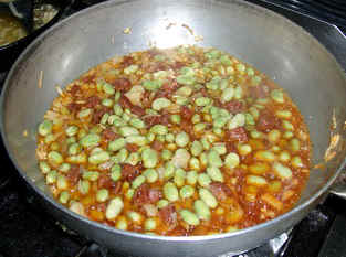 Pochar bien el sofrito con el laurel y el vino blanco. Incorporar guisantes y chocos con un poco de fumet (tener en cuenta que el choco suelta bastante líquido) y tras hervir, cocinar a fuego medio, agregando posteriormente las habas (ya que son más tiernas y hemos de evitar que se pongan "zapateras"). Vigilar para obtener un punto agradable de consistencia, poniendo a punto de sal y pimienta.