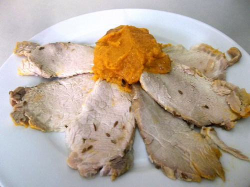 8. Cortar en lonchas la carne en frío y acompañar con una salsa de zanahoria, refriendo unas seis zanahorias grandes peladas y cortadas, junto a una cebolla grande cortada, en el jugo reservado de haber cocido la carne con el comino y sal; y luego triturándola bien con batidora.