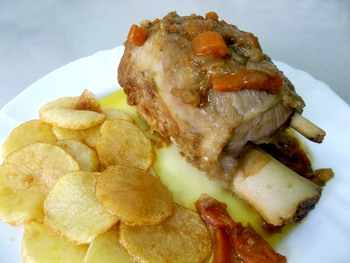 3 Dejar cocer a fuego medio durante un par de horas, dándole vueltas a los codillos con cuidado, para ir dorándolos. Si se desea se puede pasar la salsa por batidora, o servirla tal cual con los codillos y unas patatas fritas.