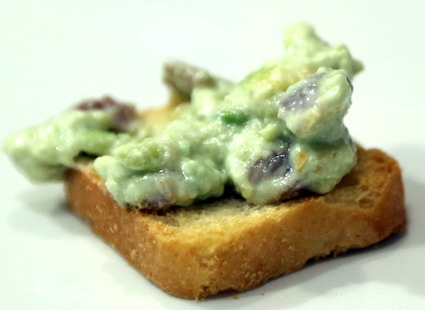 Poner el yogur en un colador, que se coloca sobre un cuenco, dentro de la nevera durante unas horas, para que suelte todo el suero. Pelar y triturar el aguacate con un tenedor y mezclarlo con el yogur desuerado. Quitar el aceite de las anchoas y picarlas. Salar la crema sólo un poco y echar las anchoas. Remover para distribuirlas y poner en un cuenco. Cortar el pan en finas rebanadas, tostarlas y ya están listas para untar. También se pueden usar de acompañamiento para otros platos.