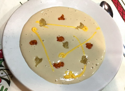 EMPLATADOEn un plato hondo o cuenco de fondo amplio, echar un decilitro, aproximadamente, de crema de almendras. Sobre la crema ir depositando bolitas de las cremas de calabaza y de cidra. Seguidamente, dibujar sobre el conjunto unas líneas de crema de yema. Las cremas se pueden hacer, siguiendo las mismas instrucciones, con cualquier tubérculo u hortaliza, como la batata o la zanahoria.