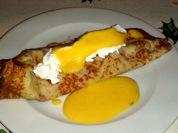 Poner una crep en el plato con un poco de mouse de turrón a un lado y un pocoo de crema de mango al otro.