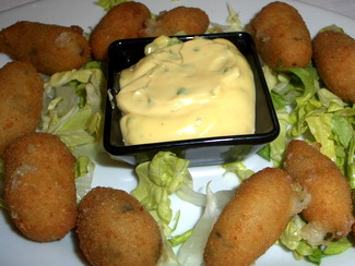 Dejar reposar unas horas hasta enfriar la masa. Sacar porciones pequeñas y dar formas de croquetas. Pasar por huevo batido y pan rallado.