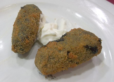 6.- Para hacer las croquetas coger porciones adecuadas de la masa dar forma y pasarlas por harina, huevo y pan rayado en este orden. Freír en aceite bien caliente cuidando de que no enfríe al echar las croquetas, se desarmarían.