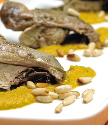 Sobre una cucharada de crema de escabeche, poner un cuarto de perdiz y unos piñones.