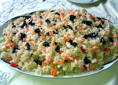 Cocer el arroz en el caldo de marisco durante 15 minutos (no refrescar), inmediatamente escurrir si es necesario y extender en la bandeja de servicio para que enfríe. Picar los pimientos, cebolla y zanahoria, mezclar con el arroz. Picar el cangrejo y poner encima del arroz con el caviar. Poner un poco de sal, pimienta y aceite.