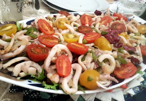 Limpiar y trocear el calamar, poner en sartén tres cucharadas de aceite, el ajo, la cebolla y el pimiento picados, una vez rendido el sofrito poner el calamar y las algas, poner una pizca de sal y pimienta. Cuando cambie de color el calamar, retirar y dejar enfriar. Poner un fondo de lechuga, encima el calamar con las algas y el sofrito, los tomatitos cortados a la mitad, una cucharada de vinagre y un poco de aceite crudo.