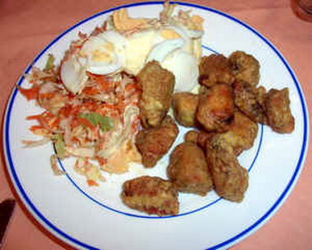 Ensalada: Cortar la col en tiras finas (juliana) y rayar la zanahoria. Mezclar bien la col y la zanahoria con la mayonesa. Cortar los huevos duros en rodajas y emplatar poniendo las rodajas como adorno.