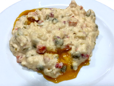 Poner en el plato una cucharada colmada de ensaladilla, hacer un hueco en el centro, y en el hueco poner el huevo escurrido de soja, con cuidado poner otra cucharada de ensaladilla encima, adornar con un poco de perejil.