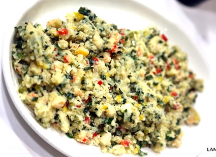 Rallar la coliflor con rallador de estrella y reservar. Picar muy finamente las hojas de shiso y reservar también. Pelar y trocear las gambas, reservando igualmente. Picar muy finamente la cebolleta y el pimiento y ponerlos a rehogar con cuatro o cinco cucharadas de aceite en una sartén honda, y cuando estén tiernos, sin que la cebolleta coja color, echar la coliflor rallada, salar y seguir rehogando unos cinco o seis minutos. Antes de retirar del fuego, echar el sichimi togarashi, y, una vez apagado el fuego, mezclar con las hojas de shiso picadas. Emplatar y servir caliente. Sirve para acompañar otros platos, fundamentalmente de pescado. Para acompañar a carnes se pueden sustituir las gambas por jamón picado, por ejemplo.