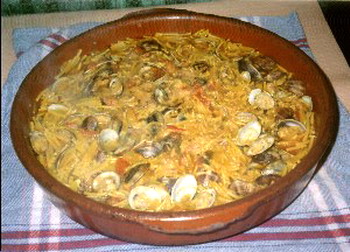 Una vez preparado el fondo agregar los fideos y el azafrán tostado y molido y cuando estén a mitad de cocción incorporar las almejas previamente lavadas. Terminar de cocer con la cazuela tapada hasta que los fideos estén en su punto procurando que nunca queden secos añadiendo algo de fumet si hace falta.