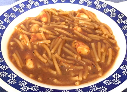 Colamos el fumé y lo agregamos ,con la pastilla de caldo de pescado y la copa de Brandy, dejamos que hierva 5 minutos y a continuación añadimos los fideos ,dejamos hervir unos 8/10 minutos hasta que los fideos estén, rectificación de sal, apagamos y echamos los langostinos y dejamos reposar y a comer