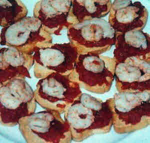En otro recipiente calentar un poco de aceite y cuando esté caliente, moderadamente echarle los ajos pelados y picados muy finos, cuando estén dorados apartarlos del aceite y la cazuela del fuego y echarles las gambas durante unos segundos, el tiempo suficiente para que se hagan y queden jugosas, este tiempo es muy corto pues las gambas se hacen enseguida, apartarlas del aceite y reservarlo. Servir en las tostadas una capa de tomate, una o dos gambas encima, un poco de ajo y por último regar con un poco de aceite de freír las gambas.