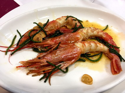 Pelar y reservar los gambones, dejándolos con cabeza y cola (opcional)). Freír los ajos con una guindilla (reservar) y añadir los gambones con un toque de manzanilla, tapar sartén y cocer unos 2-4 minutos. Saltear la salicornia con un poco de AOVE sin sal y que se frían con fuego fuerte, 1-2 minutos. Añadir los gambones y los ajos reservados. Servir caliente.