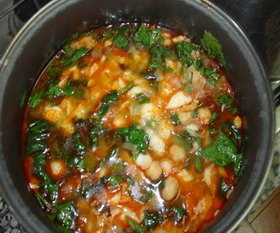 Incorporamos el refrito al guiso de garbanzos junto con el bacalao y las espinacas cortadas, rectificamos de sal y dejamos que se haga lentamente, con cariño, y moviendo la olla de vez en cuando.